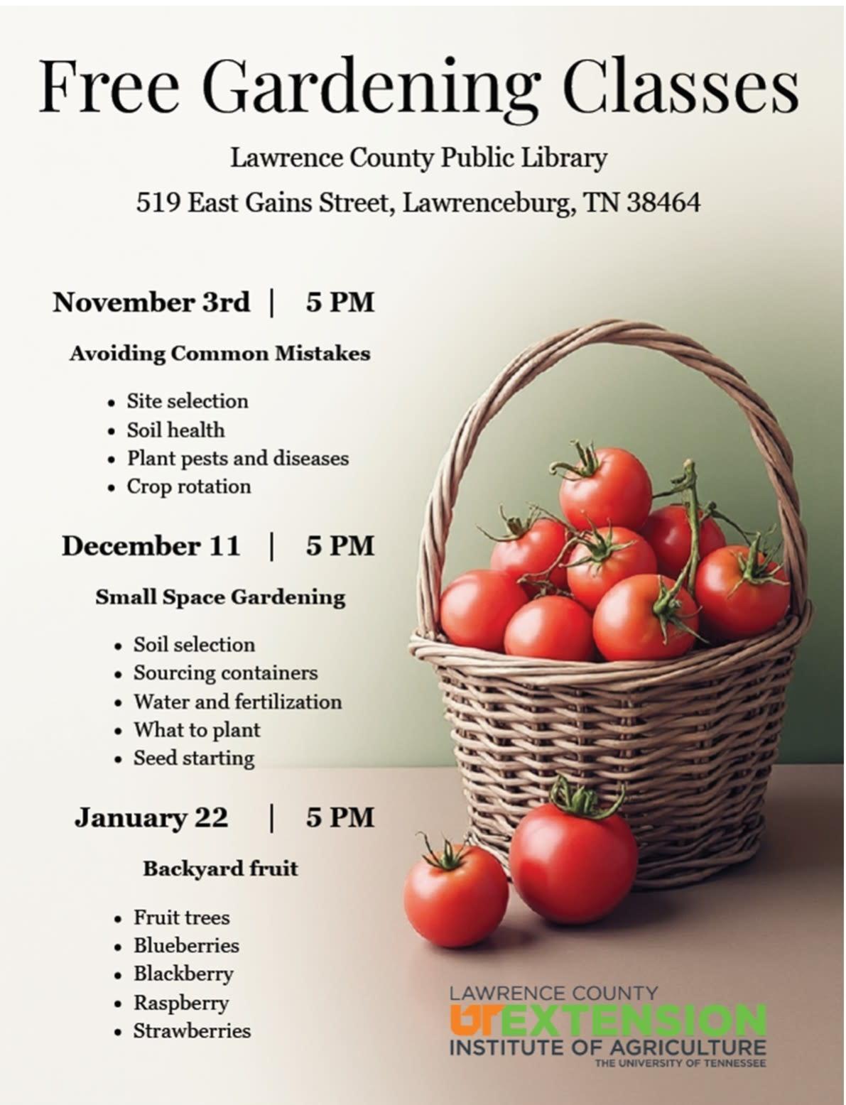 DESCRIPTION:🌿 Free Gardening Classes! Join the UT Extension Institute of Agriculture at the Lawrence County Public Library for a three-part gardening series covering common mistakes\, small-space gardening\, and backyard fruit.